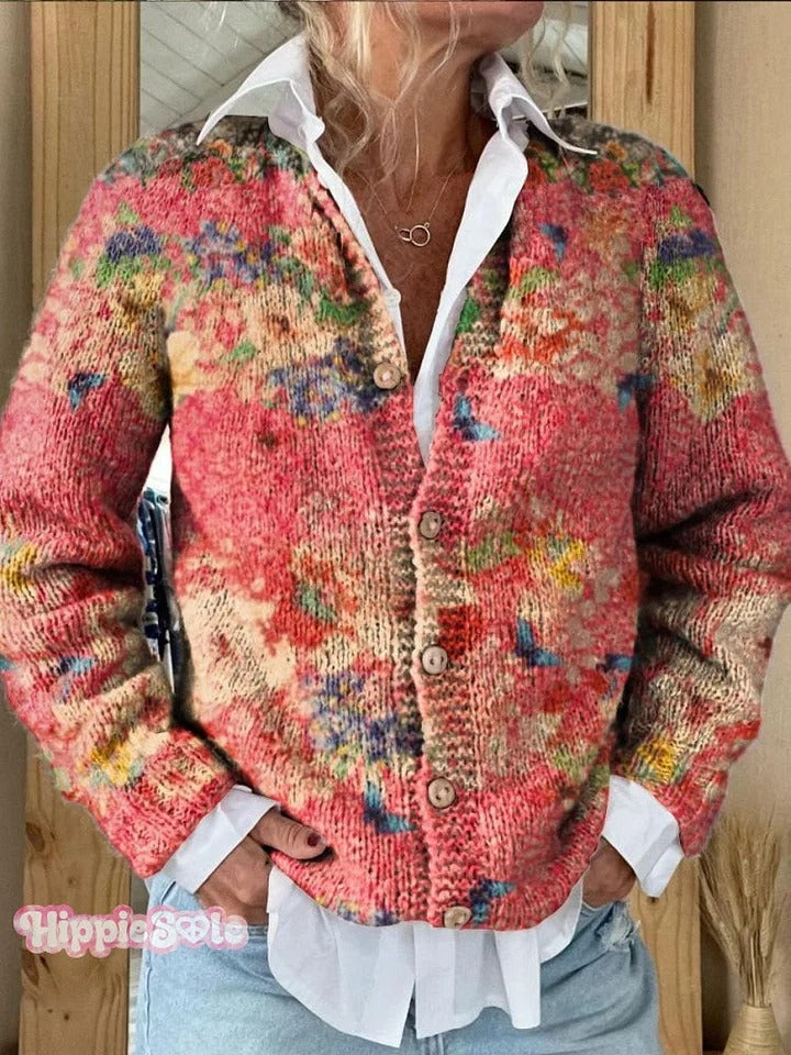 Colorful Stripes Floral Print Buttoned Cardigan Sweater