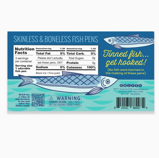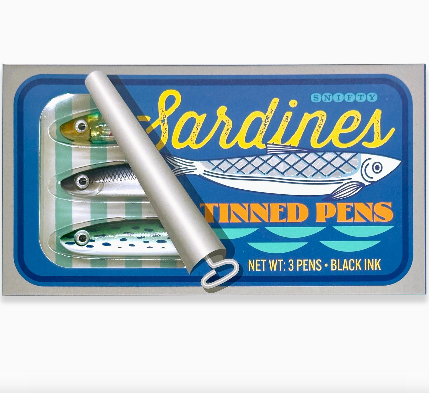 • beautifully packaged black ink pens mimic an open can of sardines! Set of 3 pens per box.